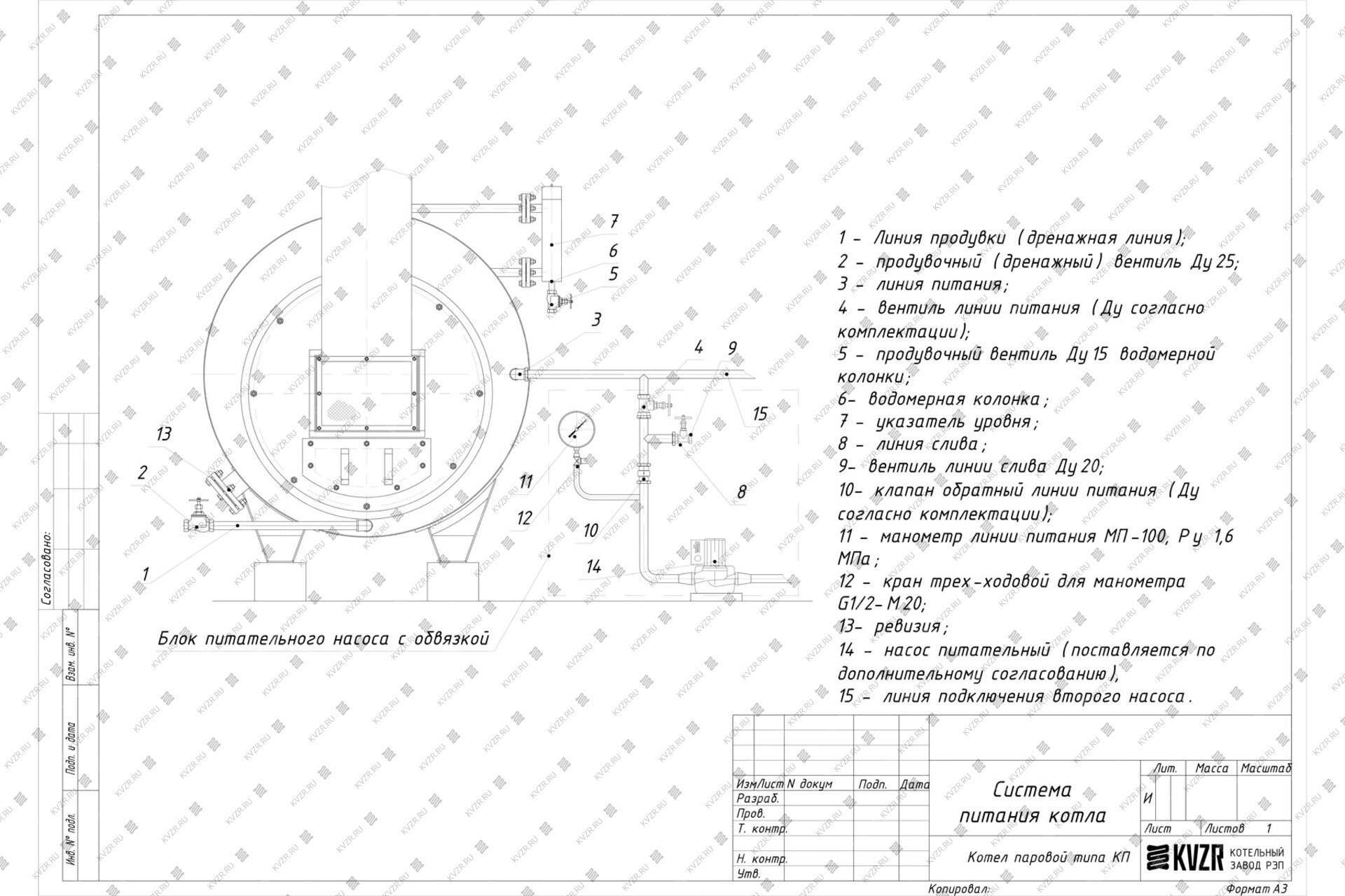 Согласно правилам, для подпитки устанавливается не менее двух питающих насосов, один рабочий и второй резервный. На стороне нагнетания каждого центробежного насоса до запорного органа должен быть установлен обратный клапан. На трубопроводе выдачи пара, в непосредственной близости от котла, устанавливается запорное устройство. На котле имеются продувочные штуцера Ду25, Ду15 и Ду10. Нижний штуцер Ду25 предназначен для удаления шлама, образующегося в результате работы котла, периодической продувки котловой воды и для спуска воды в случае необходимости. Штуцер Ду15 предназначен для продувки водомерной колонки. Штуцера Ду10 предназначены для продувки указателей уровня.