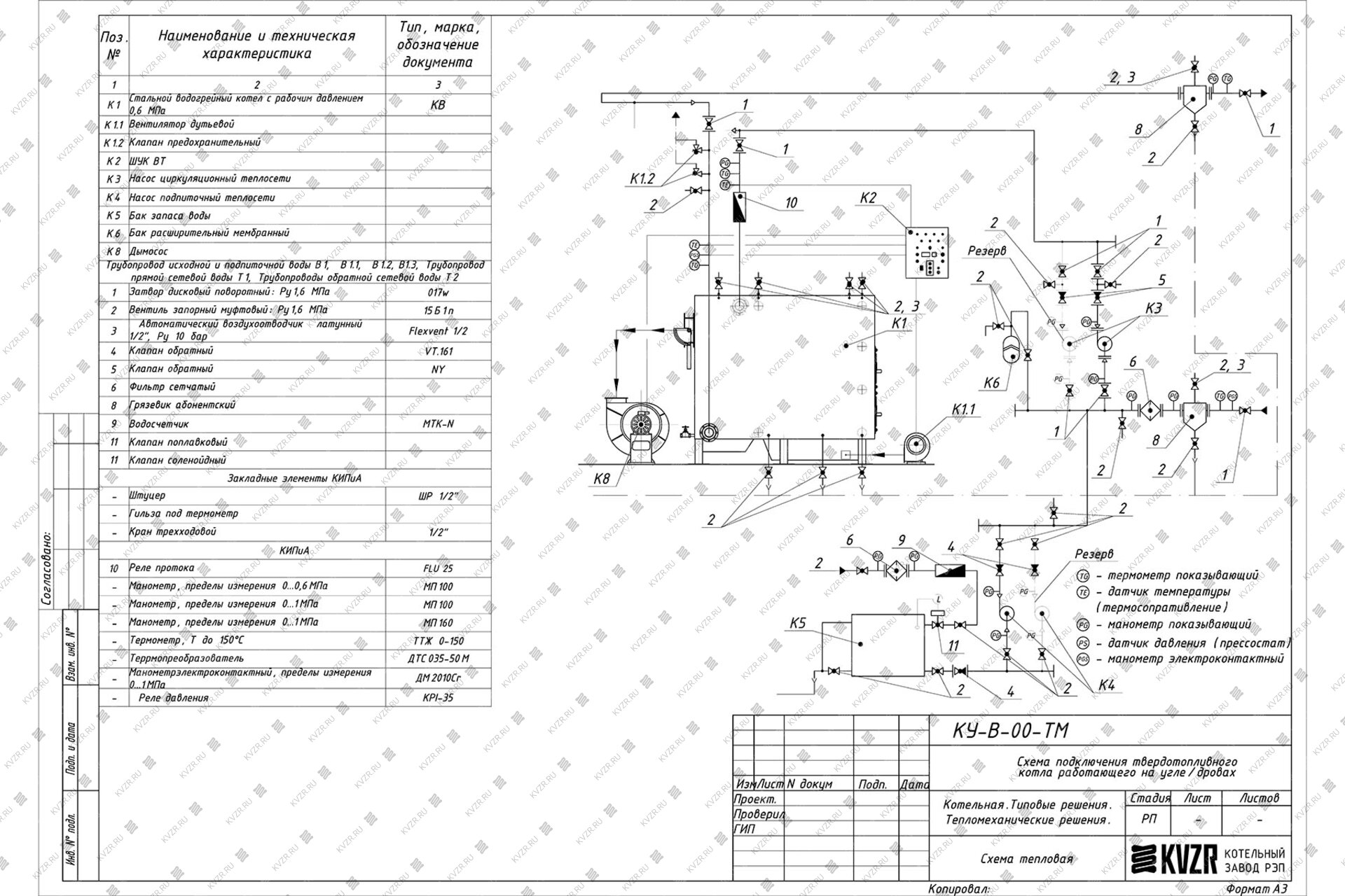 Образец тепловой схемы подключения котла 0.4 МВт уголь дрова и вспомогательного оборудования в котельной приведен на данной схеме. При эксплуатации очень важно грамотно осуществить подключение оборудования, установить все контрольно измерительные приборы, для контроля параметров работы котельной и запорную арматуру для оперативного переключения потока теплоносителя при плановой или аварийной остановке оборудования. Данную схему можно использовать как пример для разработки под свой объект или заказать у нас разработку индивидуальной схемы для вашей котельной.