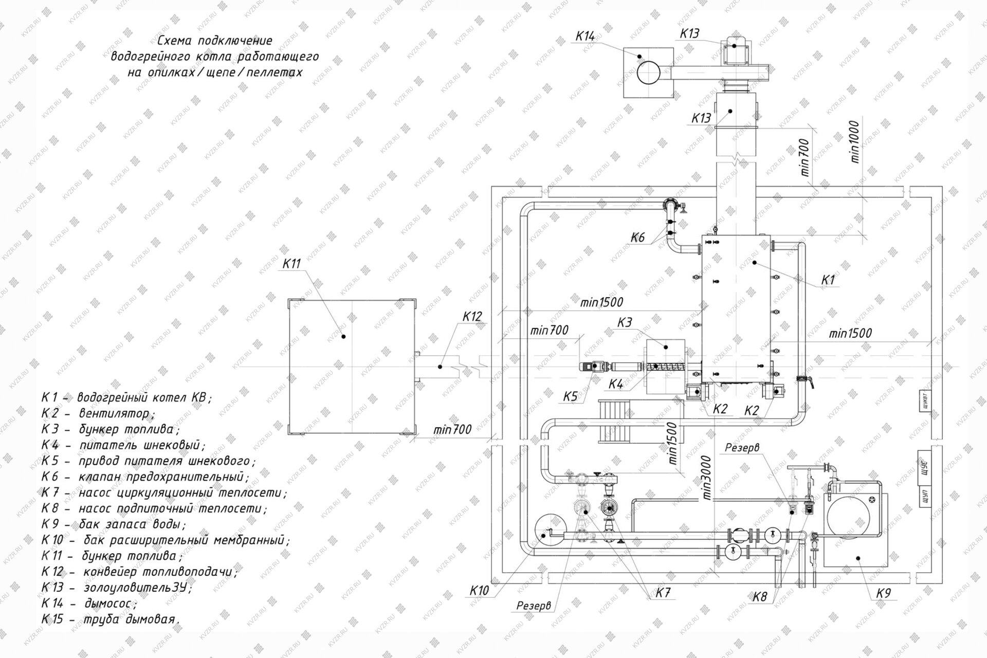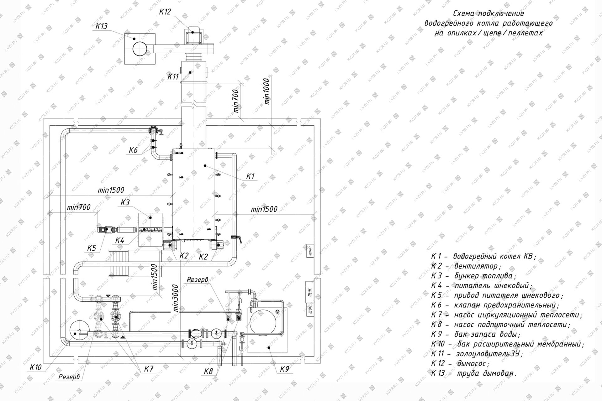 Чтобы правильно подключить котел 0.3 МВт на опилках в котельной необходимо оставить проемы для обслуживания оборудования во время эксплуатации. На представленной здесь схеме указаны их минимальные размеры. Кроме того, в данной примерной схеме монтажа водогрейных котлов и оборудования указан перечень минимально необходимого вспомогательного оборудования для правильной работы котла.